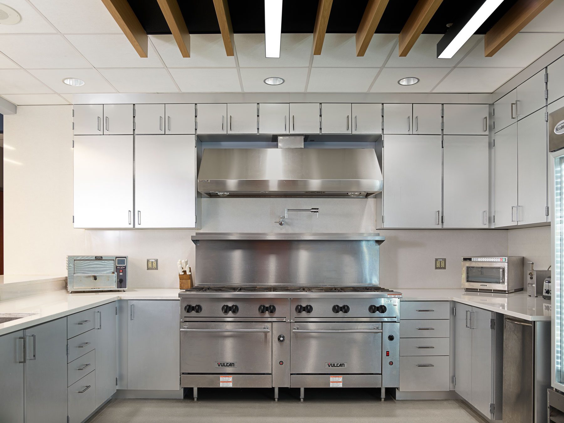 LSY Architects provided design services to revitalize key interior spaces, including full renovations of the kitchen and six bunkroom restrooms, as well as finish upgrades throughout both floors. The 835-square-foot kitchen renovation included demolition of existing finishes and installation of new polished concrete flooring, acoustical ceilings, energy-efficient lighting, casework and countertops, upgraded appliances — including a larger range — and improved pantry and storage configuration. Mechanical, electrical, and plumbing systems were updated to support the new layout and equipment.