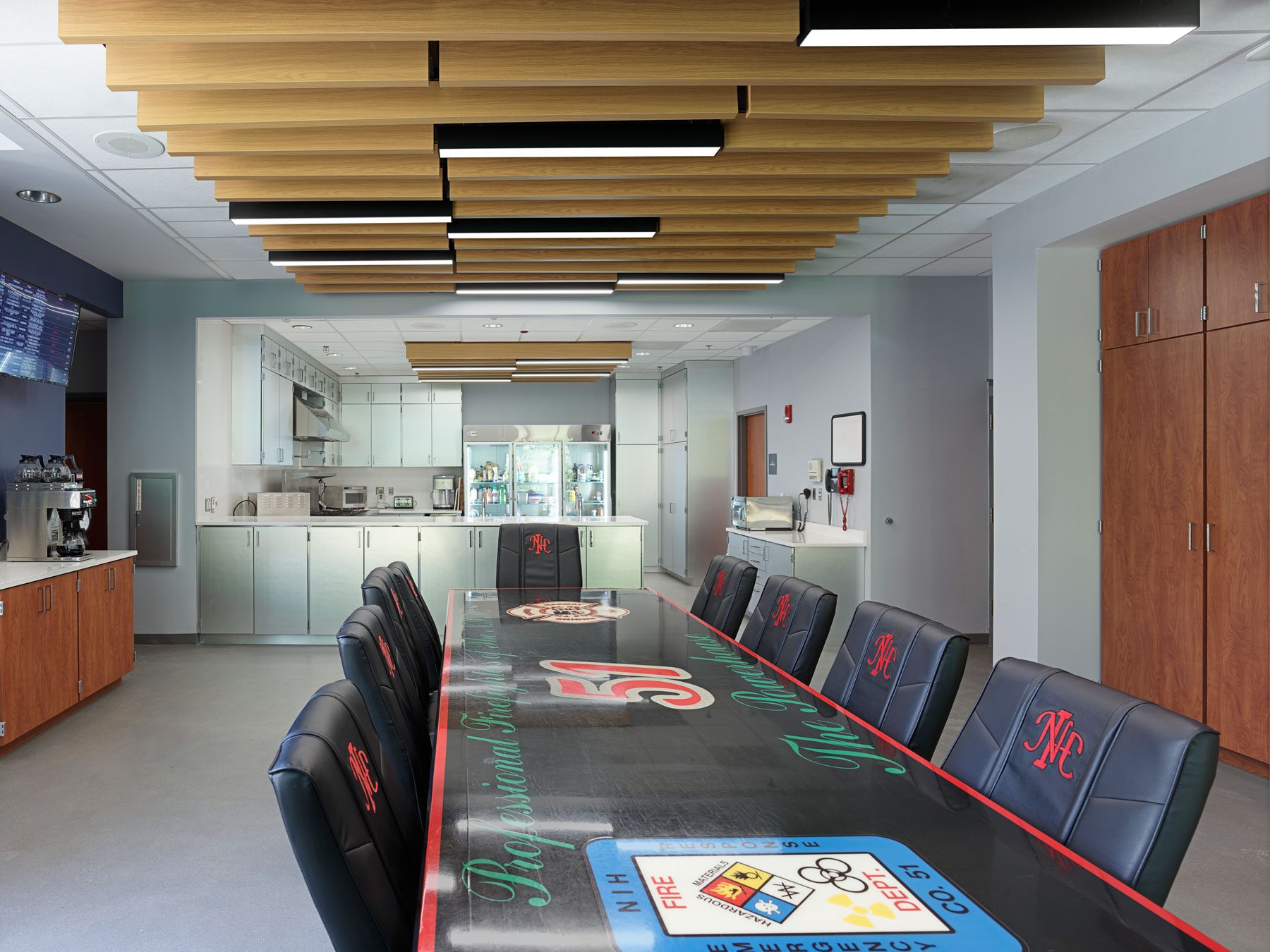 Located at the northwest corner of the NIH Bethesda campus, Building 51 houses the NIH Fire Department in a two-story, 21,290-square-foot facility constructed in 2001. The building is clad in brick masonry with precast accent bands and accommodates offices, classrooms, conference rooms, a kitchen, common restrooms, sleeping quarters with shared bathrooms, and fire truck bays. As a 24/7 emergency response station, the facility required modernization to improve functionality, comfort, and durability for continuous operation.